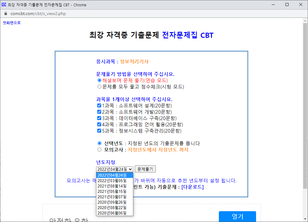 - 선택년도 : 1개의 기출문제를 선택해 문제를 풉니다.