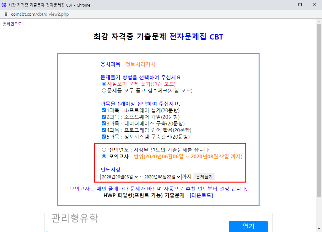 - 모의고사 : 기간을 설정해서 그 안에서 문제를 랜덤하게 풉니다. 예를 들어 2021년 1회 ~ 2021년 2회로 기간을 설정했다면 그 안에서 문제를 랜덤하게 내줍니다.