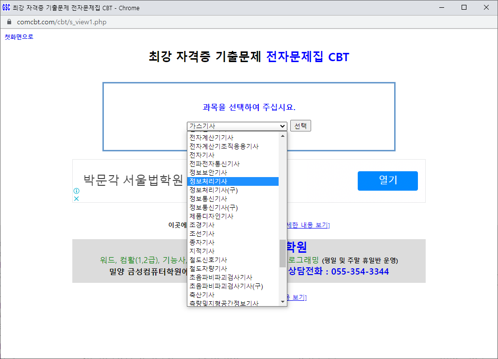 과목 선택창에서 기사를 선택하고 선택 버튼을 클릭합니다.